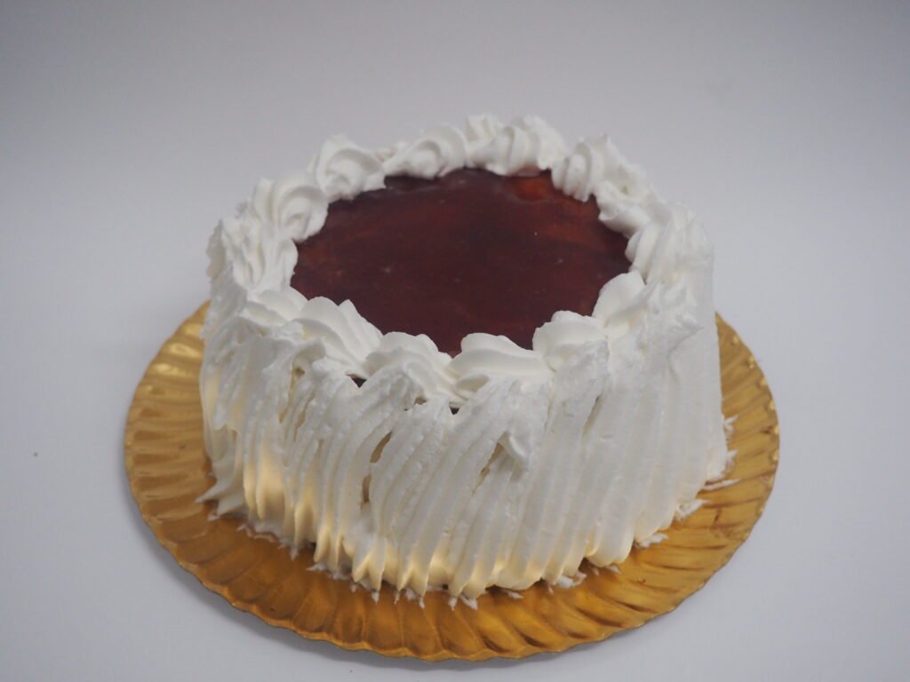 Tarta clásica uruguaya con bizcocho, nata, durazno y merengue. (Tradicional o con fresa).