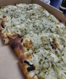 Especialidad típica de masa de pizza cubierta con cebolla y un toque de aceite de oliva.
